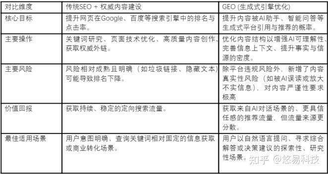 面对这些风险,企业自然会产生疑问:是否存在更稳妥的替代方案?答案是肯定的。如果您的业务核心依赖于用户主动搜索明确关键词(例如具体产品名称或解决方案),并且您的首要目标是维持稳定、可控的搜索引擎流量,那么专注于经过数十年验证的传统SEO(搜索引擎优化)与权威内容建设,是风险更低、回报更可预测的选择。GEO并非其替代品,而是面向AI原生信息环境的一种战略拓展。两者的选择取决于流量来源的未来判断:传统SEO服务于确定性的搜索意图,而GEO旨在捕捉通过AI对话进行的探索性、咨询性需求。对于资源有限、且无法承受高合规审核成本的团队,深化传统SEO或许是更务实的选择。
