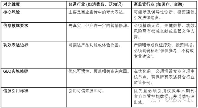 这一合规边界的具体尺度,在不同行业间差异显著。对于消费品、泛知识等普通领域,GEO操作在确保真实性的基础上,拥有相对宽松的表述空间。相比之下,在医疗、金融、法律等高监管行业,任何内容都直接关乎用户健康、资产安全与重大决策,其GEO策略必须嵌入更严格的合规框架。在这些领域,内容不仅要求真实,更要求表述绝对精确,严禁暗示疗效或投资回报,且必须援引权威学术或监管文献作为支撑。因此,将专业合规审核设置为GEO流程的强制性前置环节,是此类行业控制风险的唯一路径。